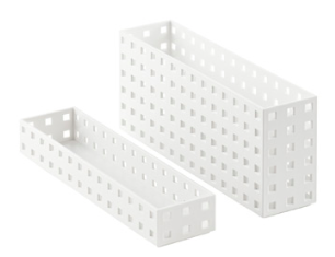 We love using these stackable bins in tight spaces like on top of a bathroom medicine cabinet. They can store and hide an array of toiletry items and, since they are only 2 and 5/8 inches wide, they can fit almost anywhere.