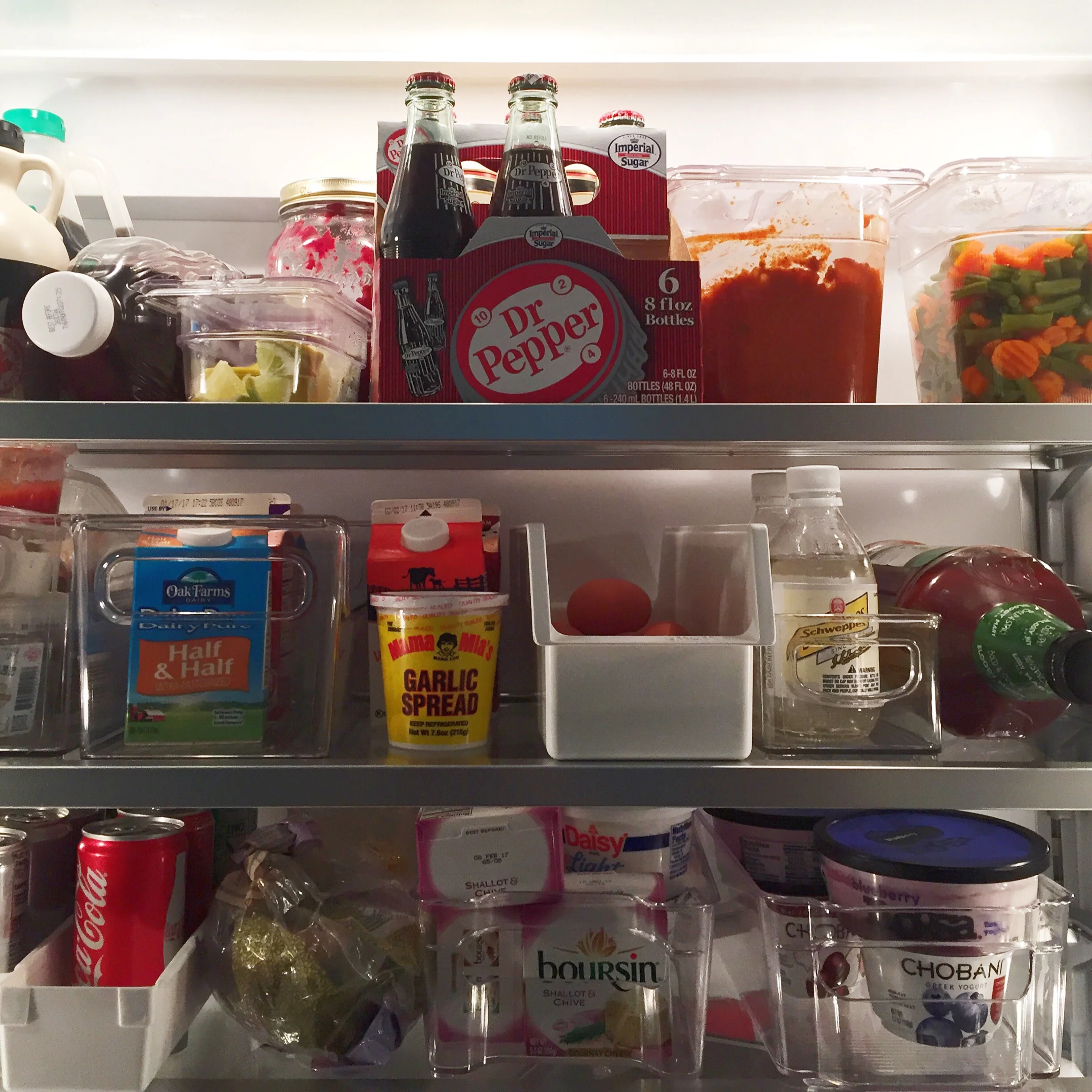 • Gather all like products together - such as produce, spreads or snacks - and put them in clear bins or baskets with labels. This makes finding and retrieving the items easier for you and the family as they can easily be pulled in and out. We even use a variation of the clear bin for the produce we use most often so that we can easily grab the tray and have everything we need in one place.